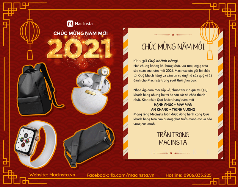 Kính gửi Quý khách hàng! Hoà chung không khí hứng khởi, vui tươi, ngập tràn sắc xuân của năm mới 2021, Macinsta xin gửi lời chào trân trọng tới Quý khách hàng và cảm ơn sự ủng hộ của quý vị